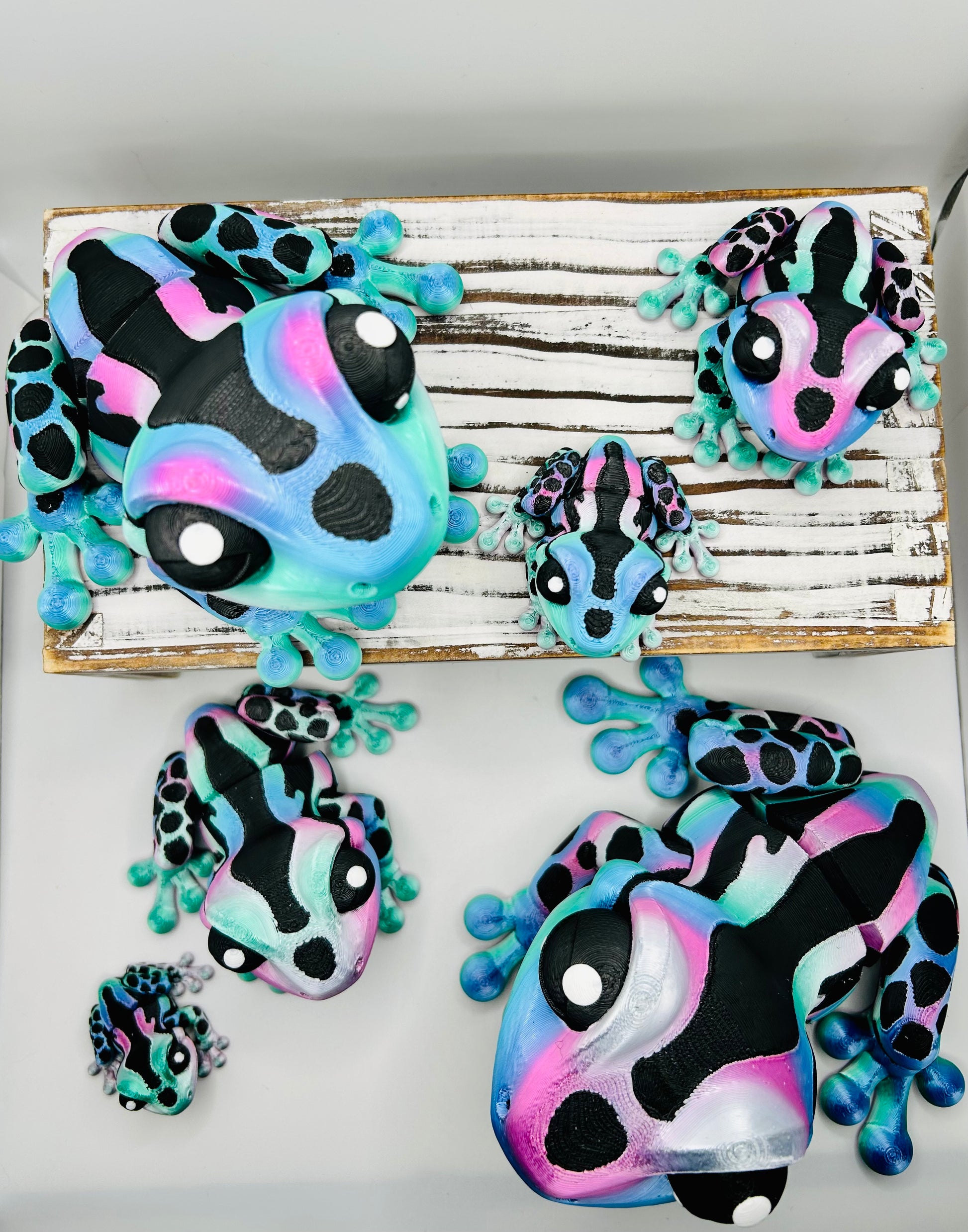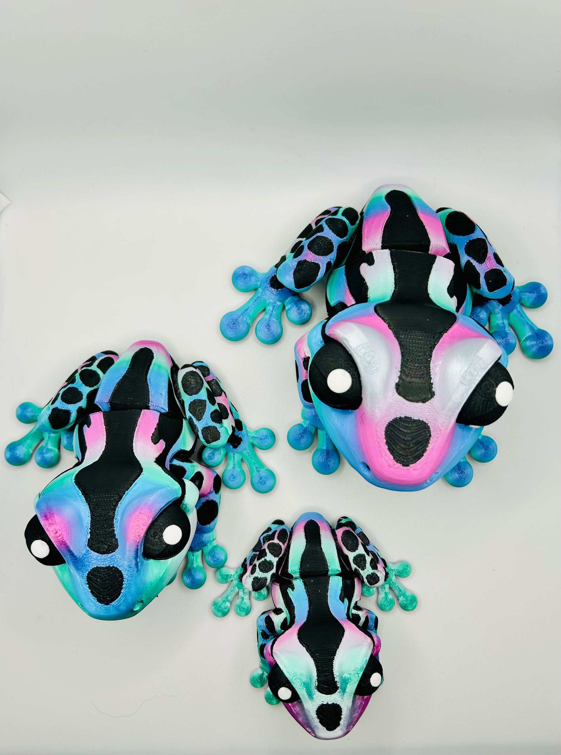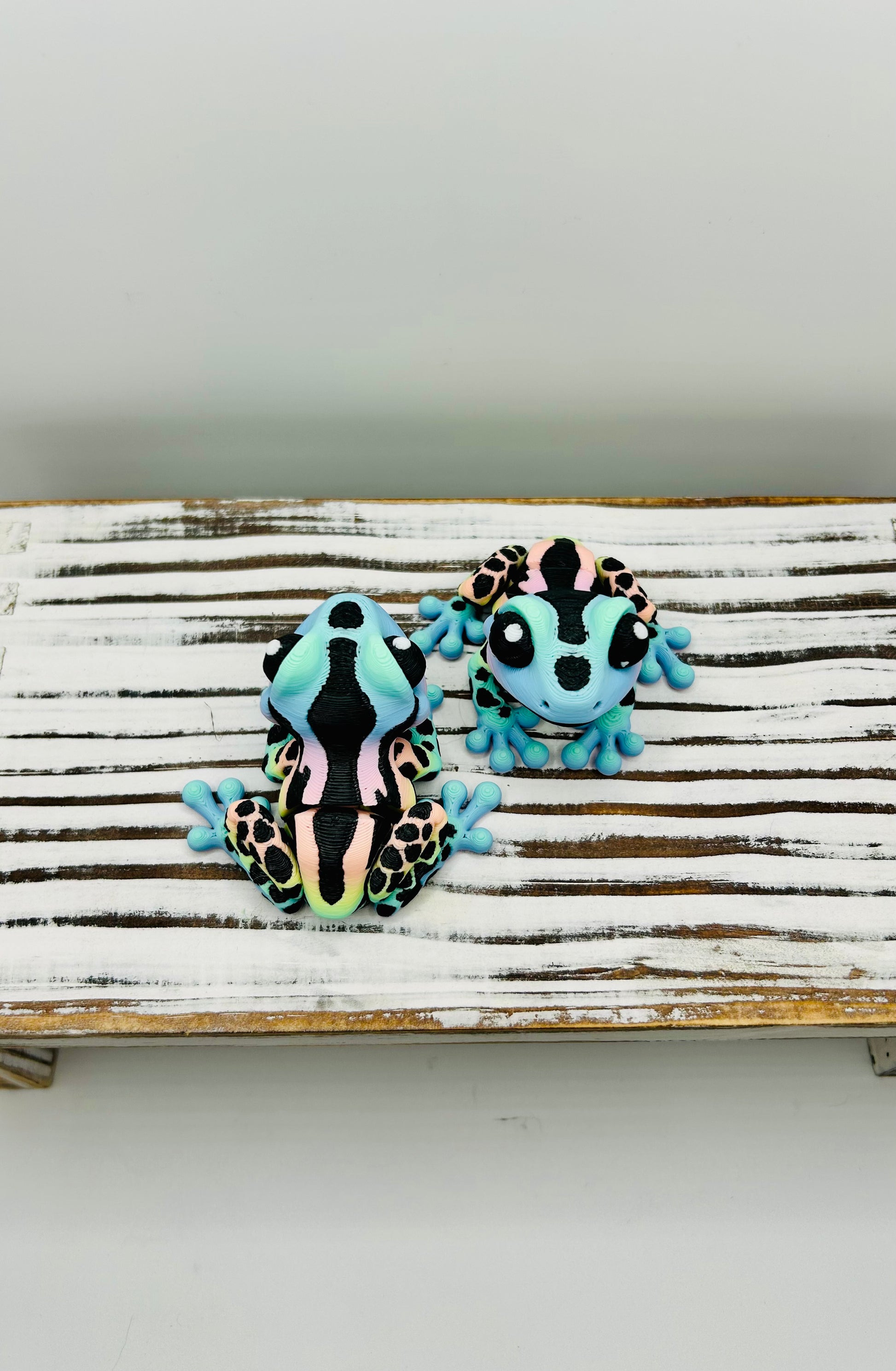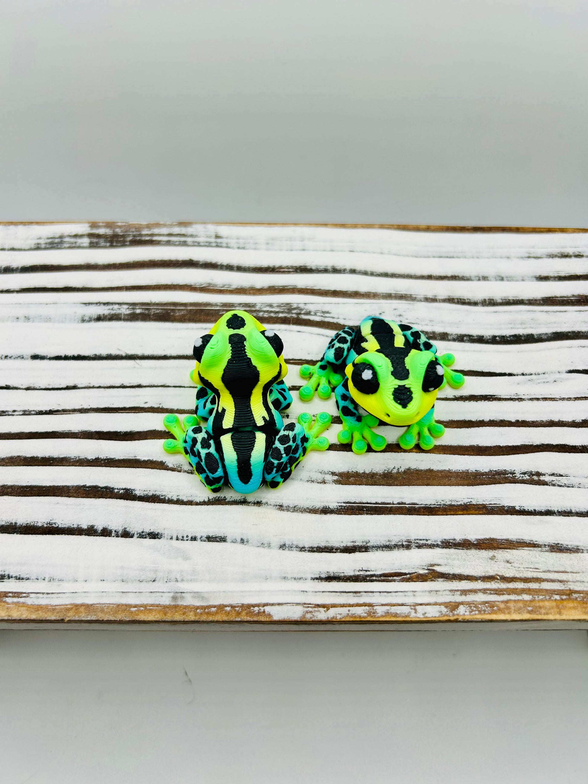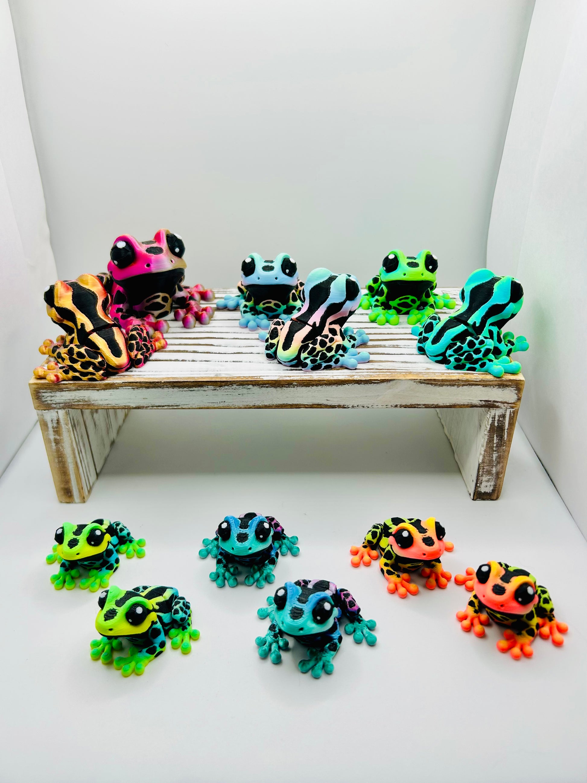 Each frog features a realistic segmented body with fully articulated legs, making them perfect for posing, fidgeting, or displaying as a unique piece of desk or shelf décor. Inspired by the dazzling patterns of real poison dart frogs, these little amphibians capture the charm of their wild counterparts—without the toxicity!